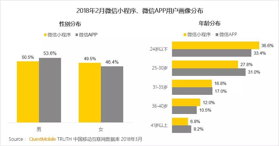 從報告中顯示,微信小程序使用占較多的是年輕人群,除此之外,微信小程序用戶和微信APP用戶特征的差異并不顯著,相對而言,女性用戶和24歲以下人群占比略高。從側面中顯示了微信小程序已經占領了大部分年輕群體,但小程序的目標并不是單一的人群,而是希望各類人群都能夠方便使用小程序。